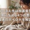 • 大量の一気飲みを避ける: 大量の水分を一度に飲むと、膀胱に尿が急激に溜まりやすくなるため避けるべきです